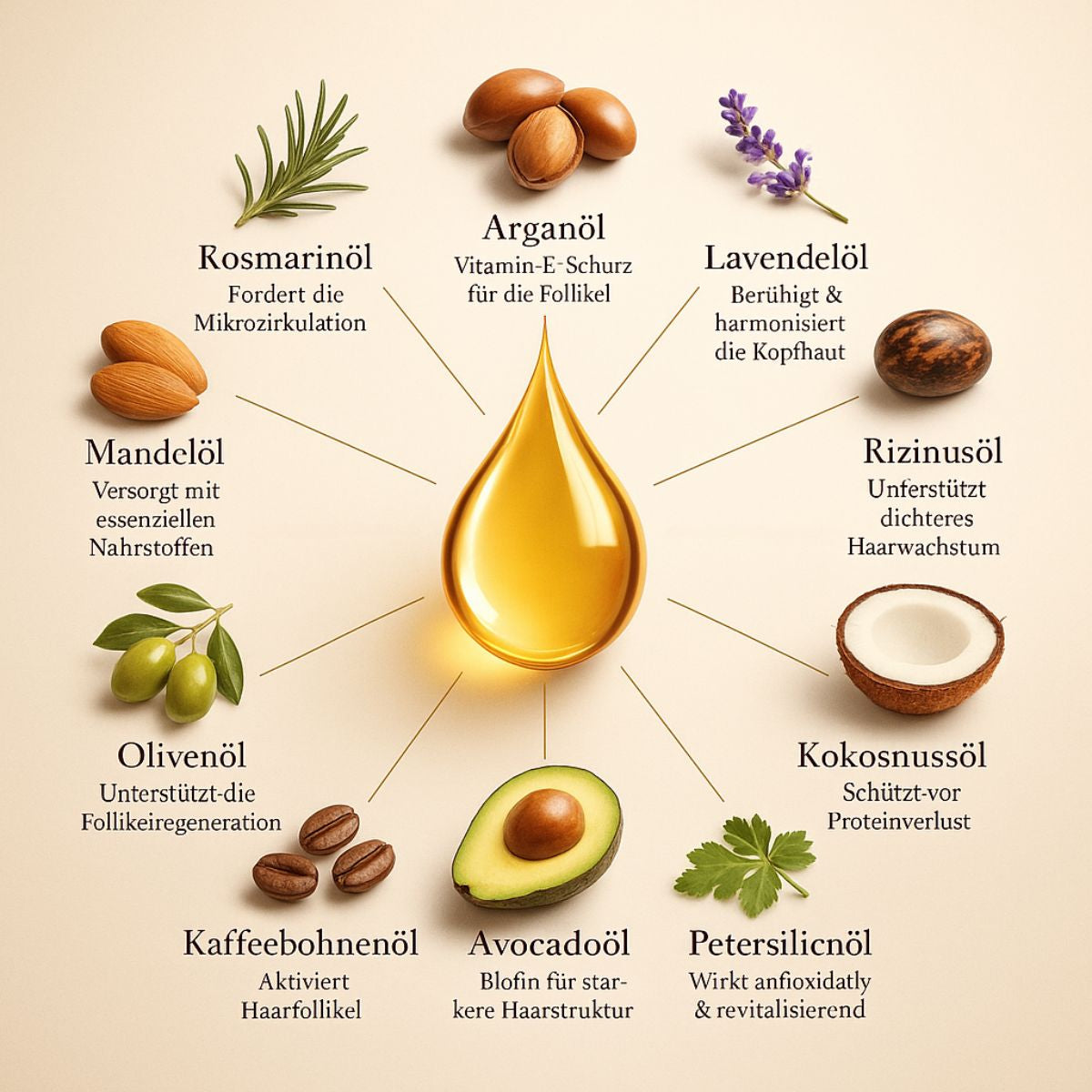 Deshalb setzen wir nicht auf ein Wundermittel, sondern auf 10 sorgfältig kombinierte Öle. Jedes adressiert eine andere Schwachstelle.