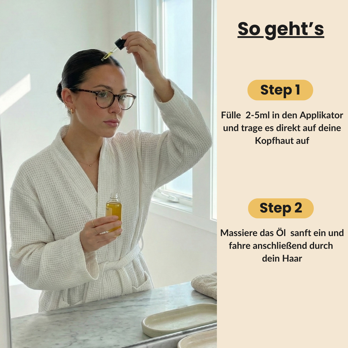 Trage das Öl mit dem Applikator direkt auf die Kopfhaut auf. Besonders dort, wo dein Haar dünner wird. Massiere es sanft ein und verteile es vom Ansatz bis in die Spitzen.