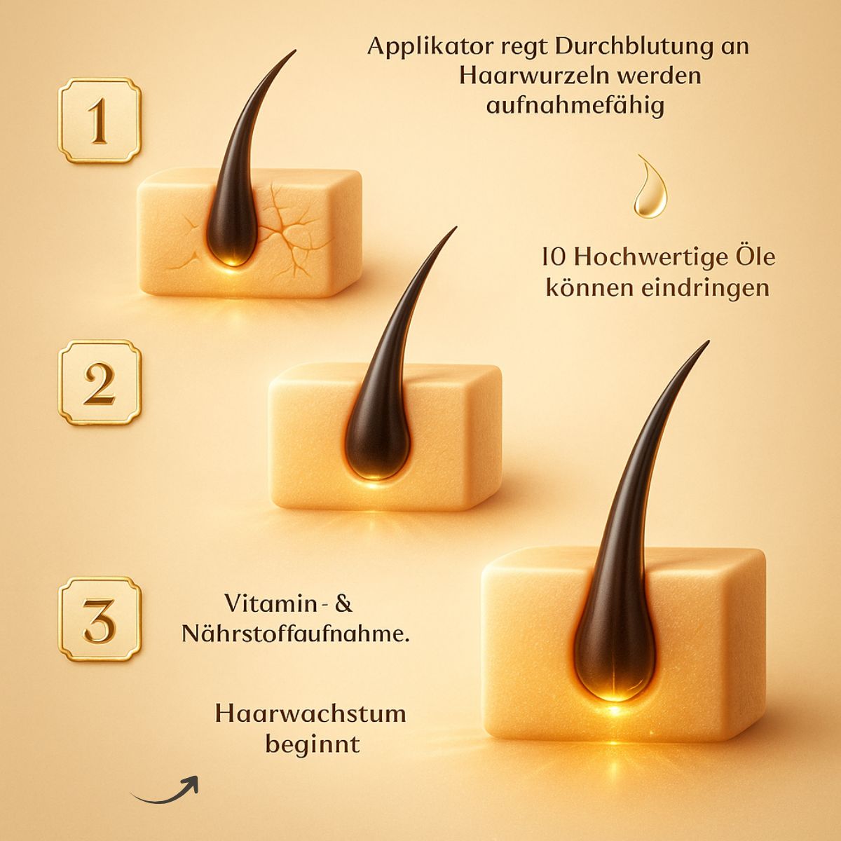 Für optimale Ergebnisse empfehlen wir, 3–5 Tropfen des Öls zwei- bis dreimal pro Woche anzuwenden und es mindestens zwei Stunden, idealerweise über Nacht, einwirken zu lassen.